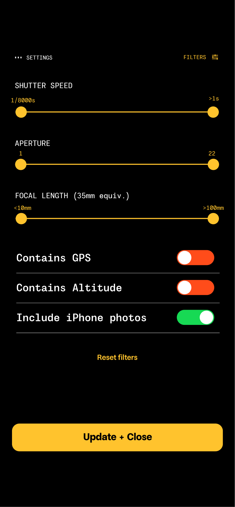 Once you import images (or take a few in the app) you can filter by certain EXIF data. Browse any shot with an f-stop under 2? No problem. Only want to see images with latitude and longitude. Got it.