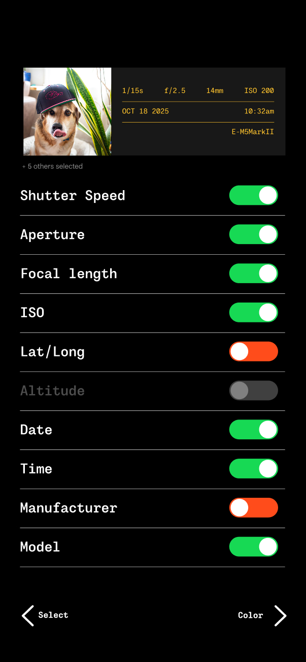 Choose what you want to show and hide. This is the entire list, even if an image has more EXIF data. A grayed out, un-toggle-able option means there isn't data for that parameter.