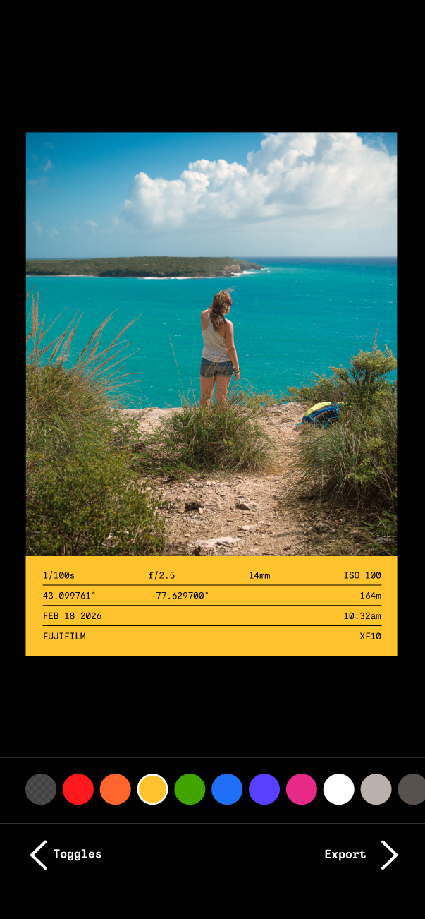The maximum exif data available to show is: shutter speed, aperture, focal length, ISO, latitude + longitude, altitude, date, time, camera manufacturer, and camera model. You cannot reorder or alter the exif data, only hide/show it. Images save at a width of 2000px (flexible height). The app costs a 1 time fee of $1.99